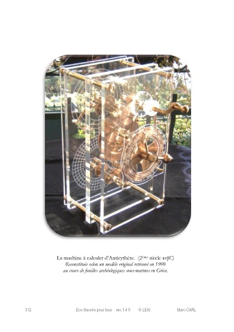 La machine à calculer d’Anticythère. (2 ème siècle avJC) Reconstituée selon un modèle original retrouvé en 1900 au cours de fouilles archéologiques sous-marines en Grèce. 312 Eco-Savoirs pour tous rev.1.4 fr © LEAI Marc CARL